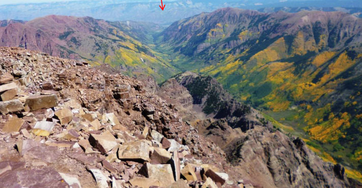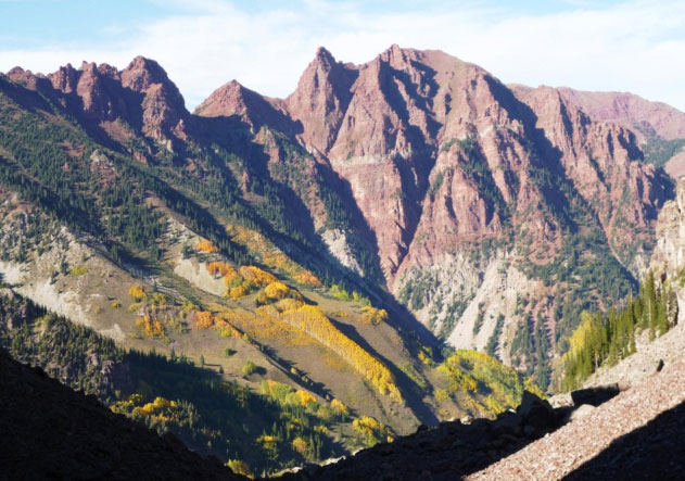 Unlike other mountains in Colorado, the Maroons are composed of metamorphic sedimentary mudstone that has hardened into rock over millions of years. This mudstone is weak and fractures readily giving rise to loose rock. You can see what I mean when you look at the rock in the “amphitheater” later in this story.