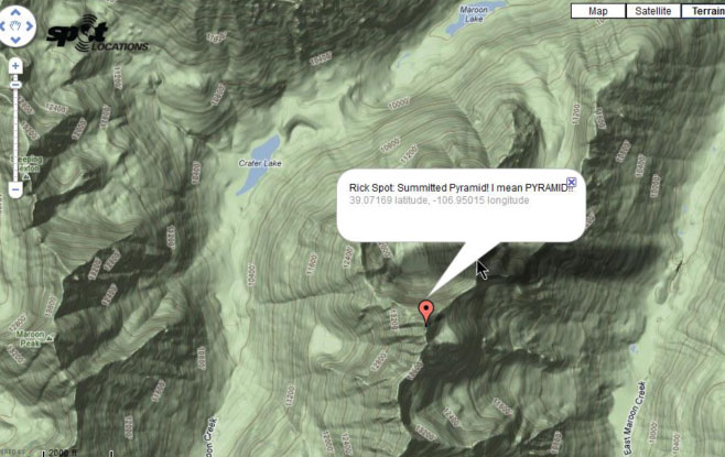 Well while Pyramid is challenging, it’s not as hard as North Maroon … and I had Andy. So at about 12:45 pm we left that glorious peak to deal with safe, slow, deliberate down-climbing. Again, no photos, Andy was busy anti-grav-ing around and choosing between exposed Class 3 climbing vs. less exposed more difficult Class 4 and we chose the latter. The down-climb was much more difficult than ascending, but Andy was calling out footholds I couldn’t see on my own. He’d do the pitch first, I have no idea how, maybe he has some extra eyeballs in his feet.
