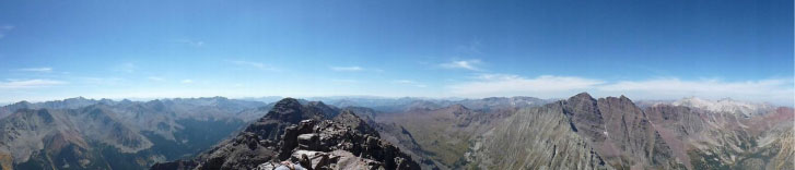 200 degree panorama shot with Capitol, Snowmass and the Bells on the right and a host of near and far fourteeners across the landscape. Andy identified about 15 of them, we could see all the way to the San Juan Mountain range!