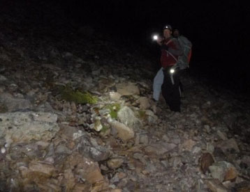 The nice thing about hiking in the dark with headlamps is that somehow you don’t notice the elevation gain. We got up the 500’ and 1 ½ miles but it was so dark we missed the cairn to the trail. For some reason it gets knocked down regularly, so we backtracked and found it and off we went.