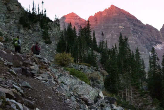 Then the alpenglow – indirect sunlight glowing red on the mountaintops as Jeff and Andrew neared the tree line.