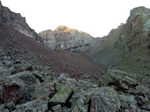 We boulder-hopped nearly to the end of the amphitheater and then headed off left to the base of a loose, steep gully that we next needed to grind up another 1000’ of elevation gain to a saddle.