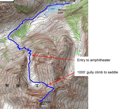 As Andy and I got to the saddle, it was the first time we could see north – and he pointed out where my house was. He declared:“Well, I’ve met my objective – I wanted to get you up far enough to see your house, now what?” Well I was feeling good so I figured we should take a closer look at what’s involved in summitting. When I turned around, I saw Pyramid – without the benefit of the informative blue and red lines: