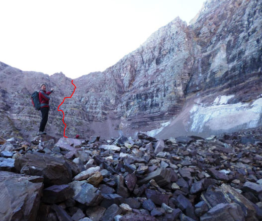 Looking up the amphitheater, we saw the sun lighting the peak of Pyramid. There is no effective photograph that can express how impressive is this basin. The amphitheater is a huge basin ending in a visible glacier, but with much of the glacier hidden under an unquantifiable amount of fallen rocks – literally from the surrounding mountains falling apart. These rocks are sharp – mud-rock cleaved from the effects of water freezing and thawing and cascading down the mountains. We heard the rock slides as we hopped from rock to rock – through and up the entire length of this ¼ mile wide and nearly 1 mile long incredible feat of nature.