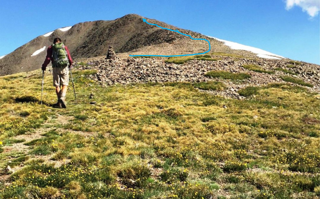 Rick at the third saddle finally heading towards the South Ridge. Technically speaking this is where the actual climb of San Luis Peak starts. The path gets thin but the cairns are well-placed and obvious. The summit approach is not visible from here. This is where you leave the Colorado Trail which leads to the right down from the saddle.