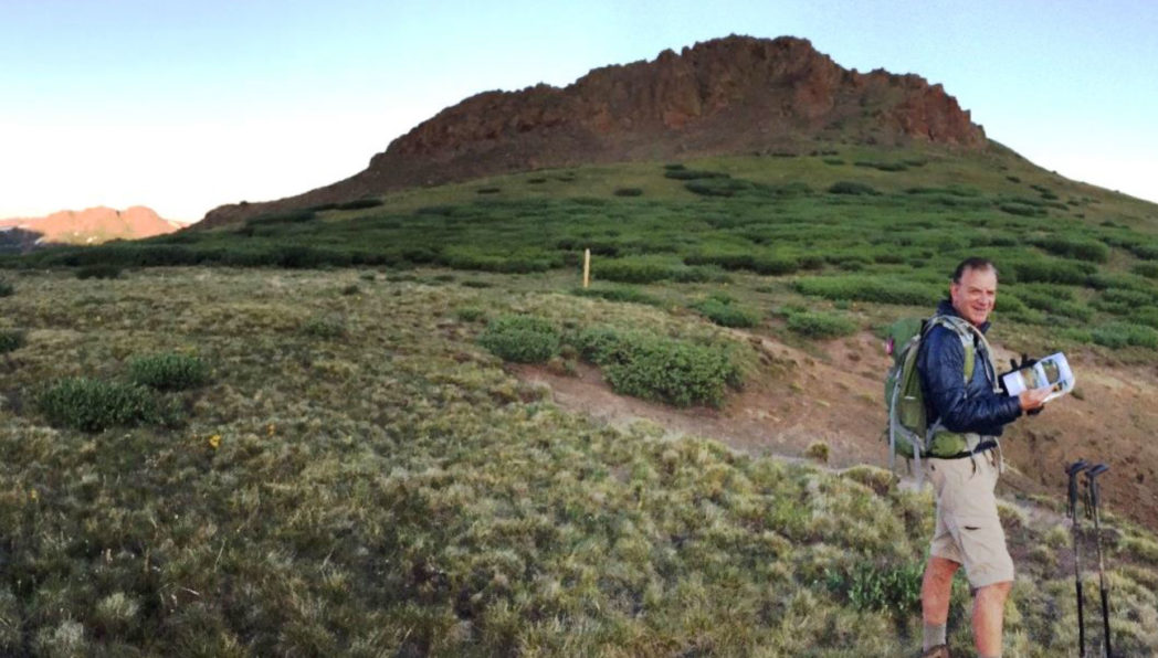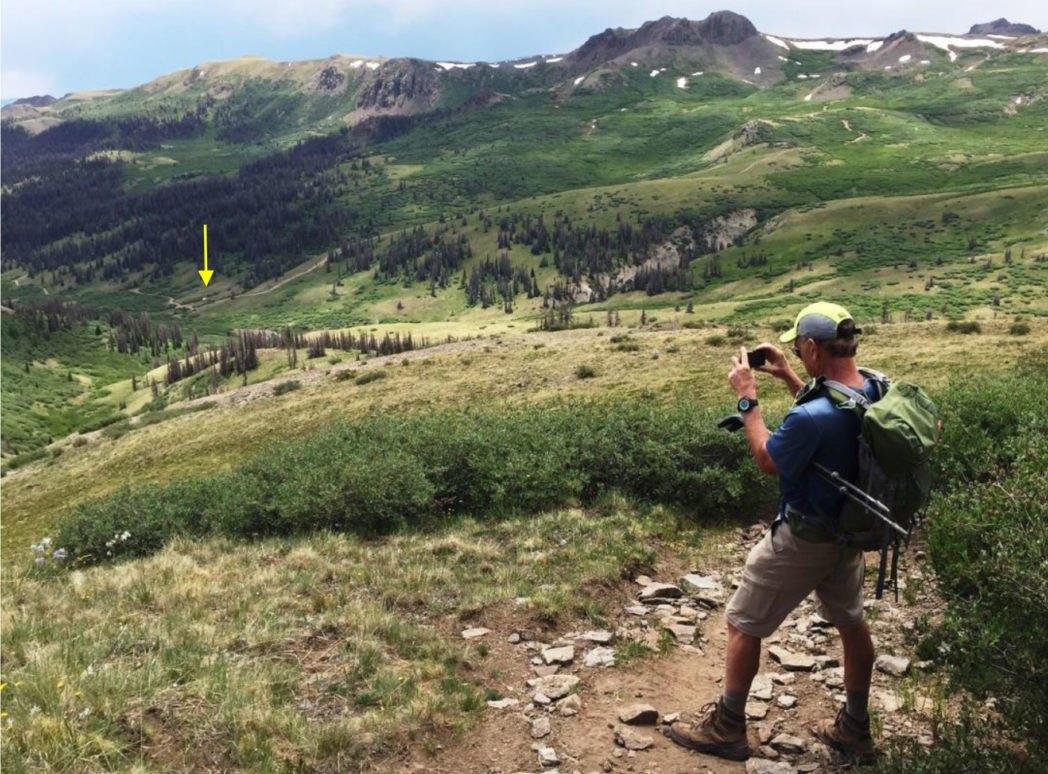 Rick checking correlating images at the first saddle. That is Pt 12,350 above and sunrise on the distant hills. The post marks the Continental Divide Trail also known as the Colorado Trail.