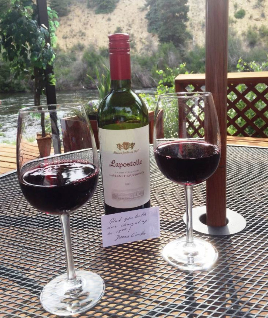 When we got to Antlers, we relaxed at the bank of the Rio Grande River and to our total surprise the hostess showed up with a bottle of wine and two glasses, with the note: