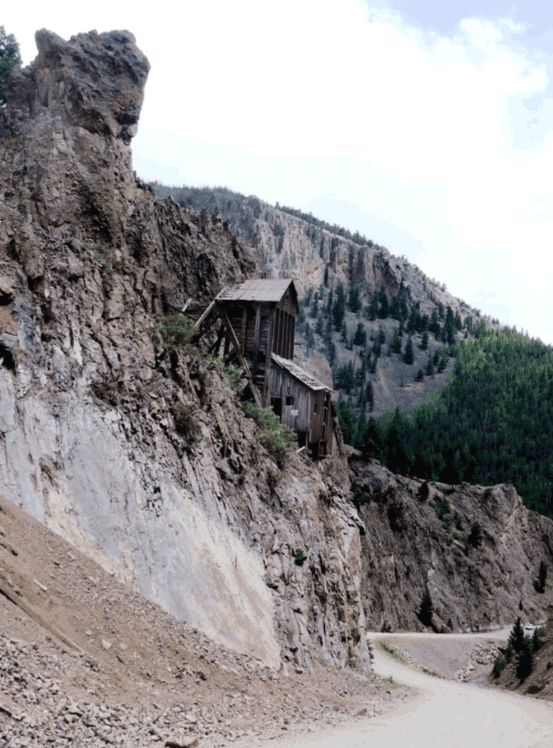 Donna is on the right at a partial view of Creede looking north into the beginning of the canyon road where incredible remains of huge mining structures line nearly vertical cliffs. This road leads straight to CR 503 which is the 9 mile drive to our trailhead.