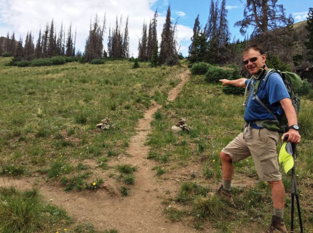 In the dark with headlamps, the path to the left looks like the main path. Don’t take it. If you do you will add 1.5 miles and some elevation gain to circle around the Point. Take the trail to the right which is steeper but more direct and tops out on a saddle at 12,300’ where you’ll see a crossing trail. That is a segment of the well-known Colorado Trail. This is a great trail that you stay on, up and down for two more saddles.