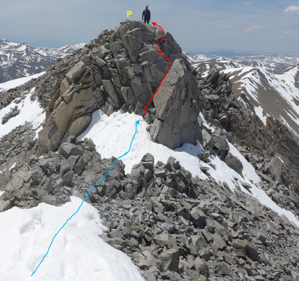 We got to the top of the final false summit on the ridge (marked “P”) at noon, fully six hours from trailhead. We started scratching our heads about how to get across to the summit. We were up on the ridge and saw no good way down continuing on the ridge. It appeared the ridge point there just fell over a cliff (see dotted red line). We looked to the right (option #2) and that didn’t look good either because to get to it we’d need to glissade a quite steep snowfield with rocks at the bottom (see red line through snow) which is a pretty standard threat to avoid in climbing – if you don’t arrest firmly enough you smash into the rocks below the snow field and that doesn’t end well.