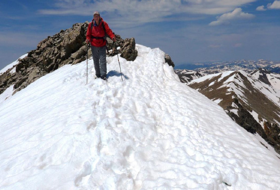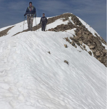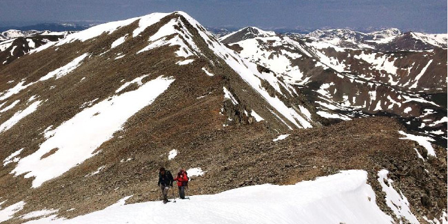 Rick and Mike staying right on the snowy ridge top from Pt 13,935 down to another saddle en-route to the next false summit.