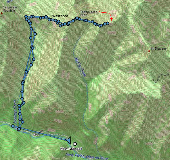 Delorme InReach tracking of our day from my “MapShare” web site – showing our progress in 10 minute intervals between dots. They were obviously much closer together on the way up than the way back down.