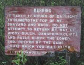 “WARNING! Hikers descending from Tabequache should avoid McCoy Gulch!! This gulch is very deceiving in that it appears easily accessible but is in reality blocked by steep cliffs. Numerous hikers have become trapped over the years and several deaths have resulted from descending McCoy Gulch.”