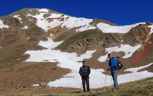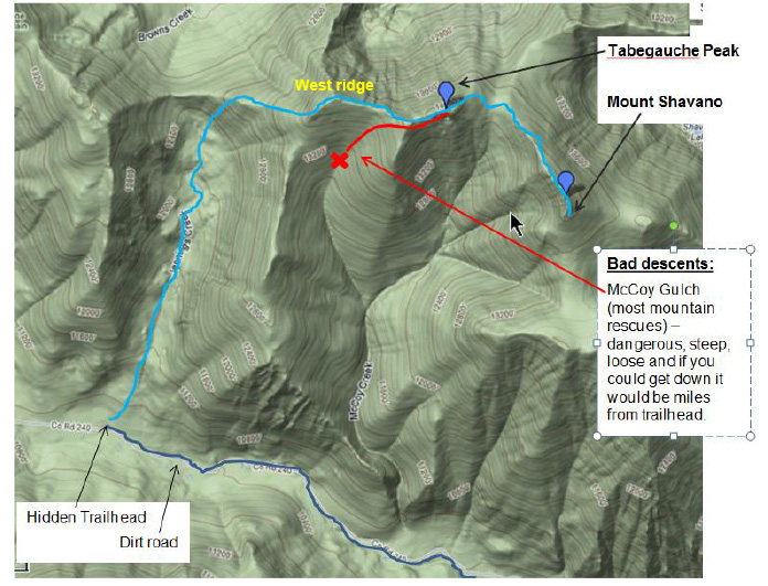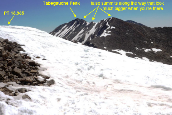 Note that the actual summit of Tabegauche is mis-marked – the cartographer made the same mistake Clif and Mike did – thinking that Pt 13,935 was Tabby! The red arrow points to the real summit. Mt. Shavano is marked correctly.