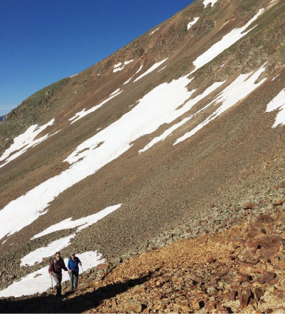 Mike (left) and Clif at 7:45 am reaching the end of the Jennings Creek valley and about to head up the rocky slope to a notch in the ridge. Carbonite Mountain, 13,663’ in the background.