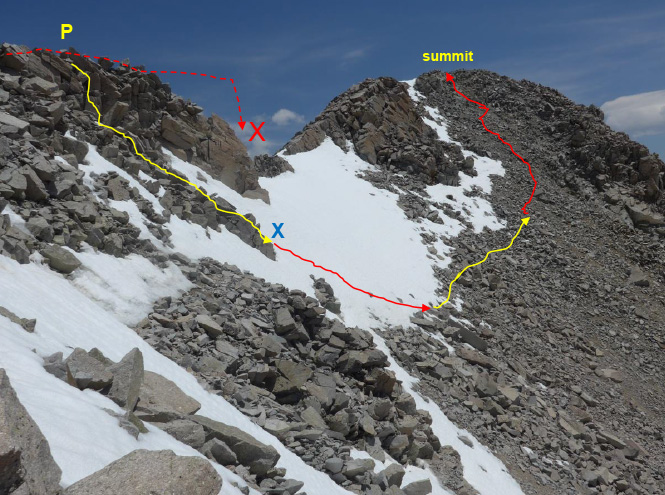 Rick and Mike downclimbed from the ridge point “P” to the blue “X” in the prior photo;
