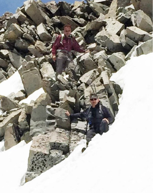 There was no way we were going to safely descend that mess, so we sent Mike, the more accomplished climber of the three of us, to scout the peak – looking down from our height, to spot what must be a better route.