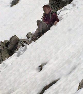 Rick in the steep-snow glissade to join Clif in the rocks below.