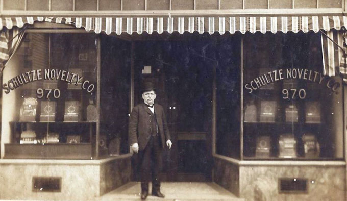 Gustave Schultz at his storefront featuring his early machines.