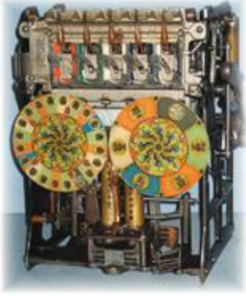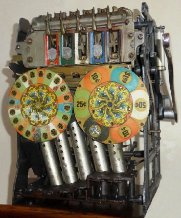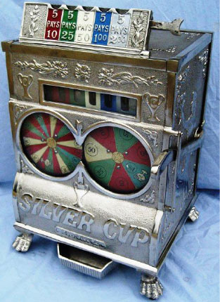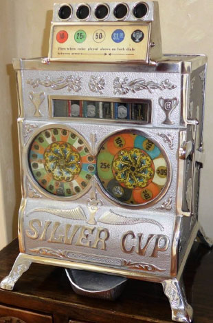 And that’s just what he did – a machine with two dials instead of 3-reels! He made them color wheels spinning in opposite directions to create a sense of anticipation and interest. Furthermore he really mixed it up – he put the five-coin head, only found on big floor-model slot machines, onto a compact table-model machine. The Silver Cup was born.