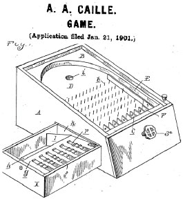 Caille Log Cabin – 1901. Game of chance in which marbles or balls are shot upon an inclined board having a series of obstructions thereon and a series of pockets at its lower edge, the object being to lodge said balls in certain of the pockets. Further to provide means for registering the count of the successive plays so that at the end of the game the complete tally thereof is obtained