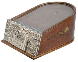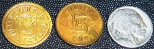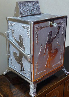 Caille actually had a patent for a game of chance way back in 1901, but with no automatic payout. Apropos of the Silver Cup – it did have a right-side lever and a dial but this device worked differently. Instead of selecting a color by dropping a coin in a coin-head, you pushed on one of the 4 buttons on top – then you pushed down on the lever handle, the dial spun and if it landed on your selection a tab would pop up in the window on top (like a cash register) indicating your winnings. Presumably you would collect whatever you won from the proprietor. No known examples of this device exist to my knowledge.