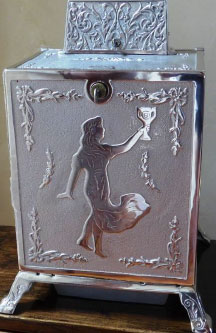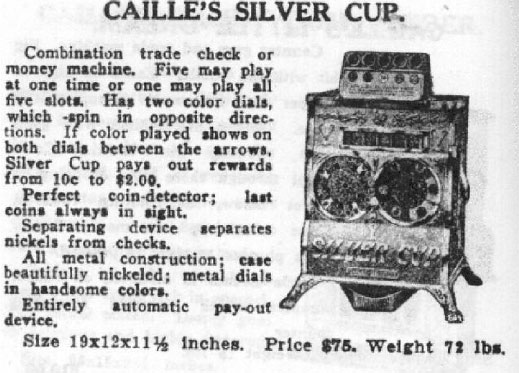 By 1910 or so, the Fey Silver Cup must have caught the attention of the Caille brothers. By 1911 they had developed an attractive and nearly identical-looking version of the Silver Cup with decorative dial graphics and using similar principles of operation. Some current-day collectors think of Caille as a copy-cat manufacturer, albeit with a great sense of engineering quality and esthetic-design attractiveness. Caille had indeed followed Fey not only with the Silver Cup but also earlier with its version of a Liberty Bell 3-reeler, among some others.