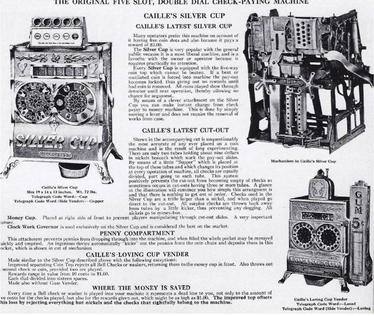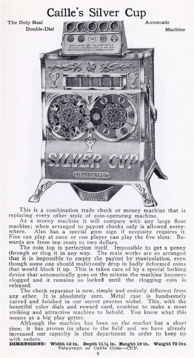 The Caille Brothers Company was incorporated in Michigan in 1901 with a capital stock of $300,000. Coin-controlling machines of fully 80 different types are manufactured (in 1909). The annual output of the plant has now reached the enormous average of 12,000 machines, all of which are fully protected by patents issued to the Caille brothers. [Well, they did successfully patent some of their devices, but this statement is an exaggeration since many payout games-of-chance were not patentable and some were copied from Fey designs]