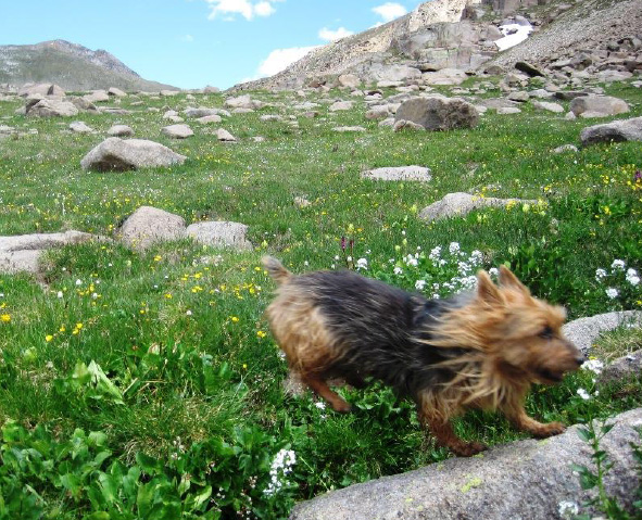This is a Class 2 hike, (rocky underfoot) but dogs such as these who are accustomed to the terrain can make it up. They seem to know just where to place their paws.
