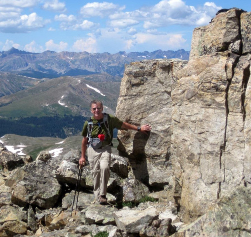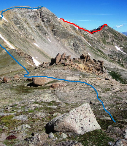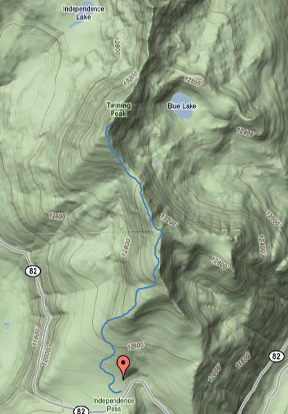 I’m often asked, “What’s a mountain excursion near Aspen that’s not too difficult?” Most of the high mountains surrounding Aspen are among the most difficult in the state. But from the parking lot on the top of Independence Pass, looking north – there is a high 13er that can be done in less than 5 hours round trip. It’s called Twining Peak, although some locals call it “Blue Peak” probably named after Blue Lake which this peak towers over. Twining Peak is a “named” thirteener and a fun hike that should be started early in the day to avoid afternoon thunderstorms. It can be done as a loop as shown: blue being the uphill route and yellow is the descent, although you can also descend on the blue line but you’d need to re-summit Blarney Peak.