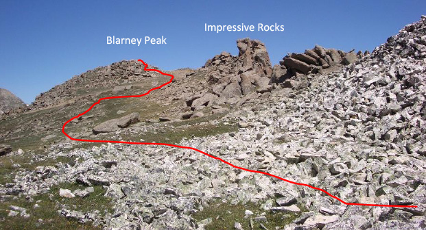 Another view – the rock pile on the right are the “impressive” rocks shown above. To the north you will see the route to Twining Peak (red) past Blarney Peak.