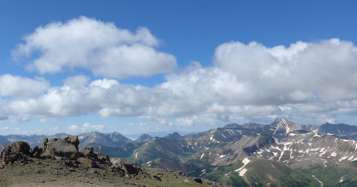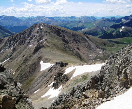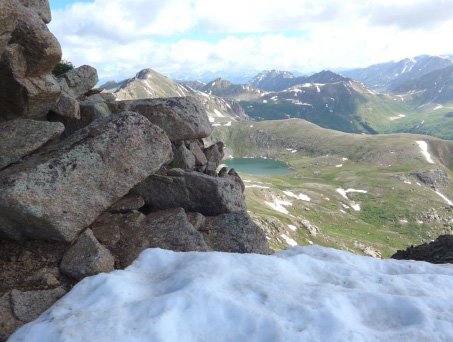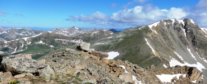 The views are really inspiring – fourteeners all around in the distance, valleys, gullies and rocky meadows – it’s a 360 degree panorama.