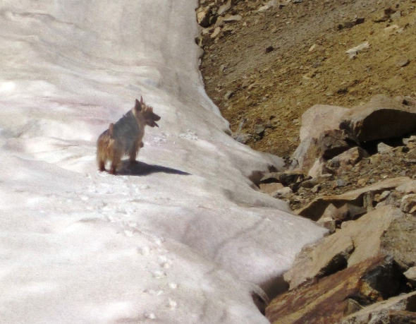 It’s time to add in my companions. Here is Alfie the Australian Terrier. On a mountain Australians will always seek either a high rock to climb or snow – anything that’s fun.