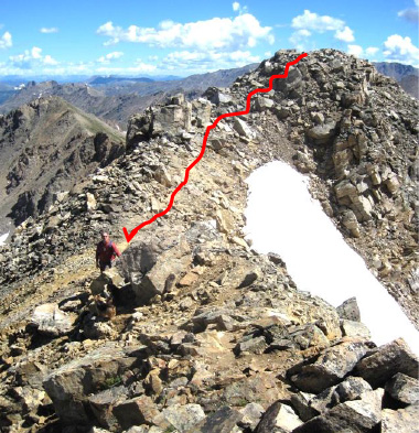 After passing the vertical rock and its rock pile, head up not quite to the ridge and bear off left under the impressive rocks on the ridge. Looking ahead to the north you’ll see a peak. That is Blarney Peak at 13,520’ which you will need to summit in order to see and access the route down a ridge to a saddle on the other side.