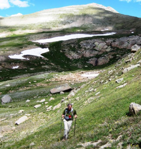 Rick C. heading down from the saddle returning via the lower meadow rather than re-summiting Blarney Peak.