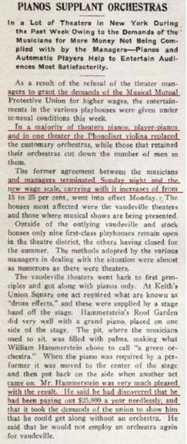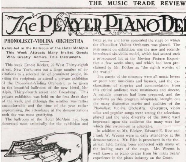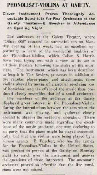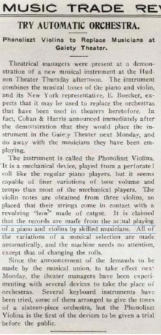 A boost was further given to the machine’s sales when the musicians union went on strike. Technology to the rescue!   (note that the “Phonoliszt-Violina Orchestra” mentioned in the article below is just a nickname used by the publication for the Phonoliszt-Violina. They’re not referring to the later Violina Orchestra with drums, ranks of pipes, etc., introduced in the late 1920s.)