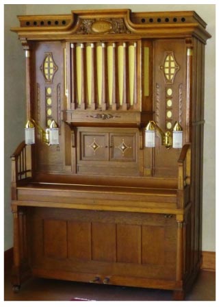 The piano expression is a simple but effective mechanism. A suction regulator provides three levels of loudness with gradual or sudden changes from one level to another. The piano hammer-rail is divided into bass and treble, with control of the bass half that allows treble piano solos.