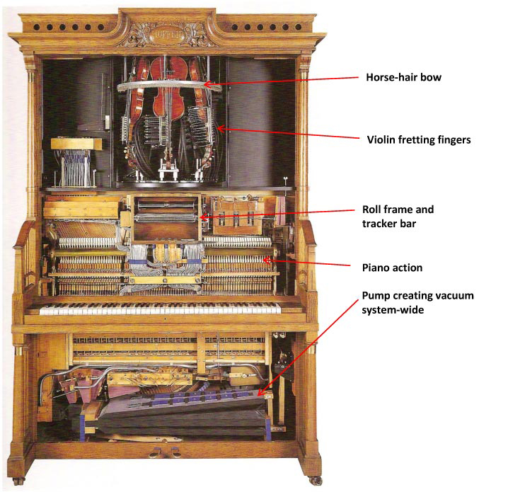 During the period 1895 to 1935 music was spread geographically through the use of automatic music players controlled mainly with pneumatics. Air pressure and vacuum conducted through a maze of tubing allowed for astonishingly responsive actions needed to actuate a piano action (as with player pianos), organ pipes (imitating string and wind instruments), percussion (drums, xylophone, triangle, etc.) and eventually the most difficult of all – plucking a banjo and bowing real violins. Control was from a punched paper roll that traveled over a metal “tracker bar” that enabled sensing the holes in the roll as they passed over the holes in the tracker bar.