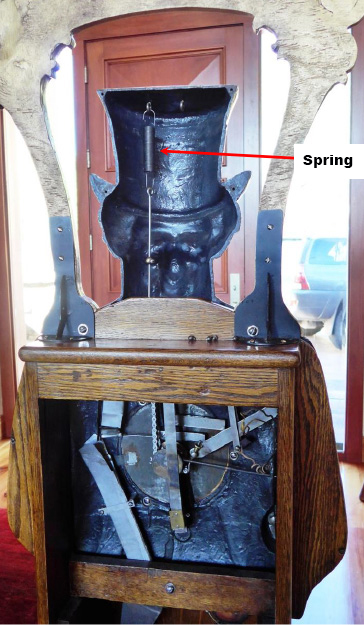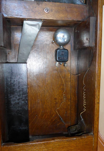 Above: lower rear of Sam. On left is the coin chute entering the top of the cash box enclosure. The bell is powered by a 1 ½ volt dry cell battery (on order at the time of this writing). It rings when the hand squeeze is strong enough to register 300 on the front dial.