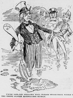 Fig. 4: 1902 from a Judge Magazine editorial cartoon after US conquest of the Philippines. Uncle Sam stepping across the ocean into the Philippines loaded with symbols of modern civilization.