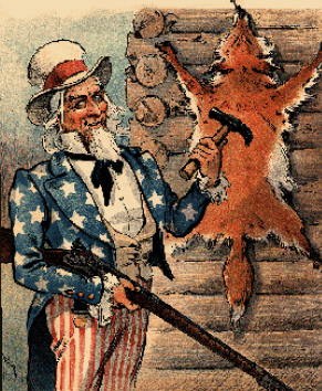 For purposes here, we’re more interested in the visual of Uncle Sam which began appearing in political cartoons, often derisively at first, up through the Civil War, in which he was portrayed in everything from pajamas to eveningwear. He was young, old, fat and thin. At one point he was even a tantrum-throwing toddler. It wasn’t until 1856 that Uncle Sam grew his first beard, which he would alternately gain and lose until Abraham Lincoln was elected President four years later. With Lincoln as President, the Union became associated with the image of a tall, lanky man with a beard — an image that transferred, and stuck, to Uncle Sam forever after as can be seen in the cartoon depictions below from the late 1890’s to early 1900’s.