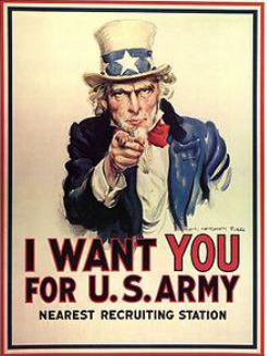 It is said that Uncle Sam didn’t get a standard appearance until the well-known “recruitment” image of Uncle Sam was created by James Montgomery Flagg. Many historical accounts assert that it was this image more than any other that set the appearance of Uncle Sam as the elderly man with white hair and a goatee wearing a white top hat with white stars on a blue band, a blue tail coat and red and white striped trousers.