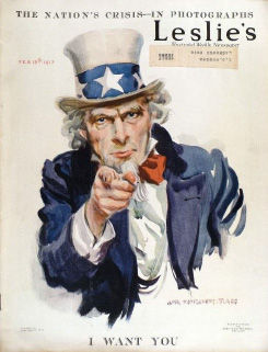 Fig. 7: The poster image of Uncle Sam was shown publicly for the first time in a picture by Flagg on the cover of the magazine Leslie’s Weekly, on July 6, 1916 and again on the cover of the Feb 15, 1917 issue shown above left. More than four million copies of this image were printed between 1917 and 1918. Flagg used his own face for Uncle Sam, and Army veteran Walter Botts provided the pose.