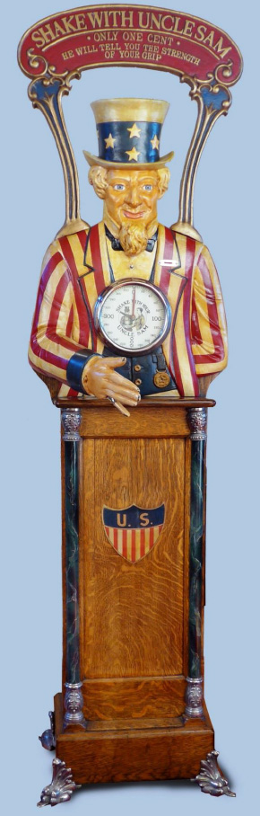 The earliest version of an Uncle Sam grip machine was created by the Howard Company in 1904.