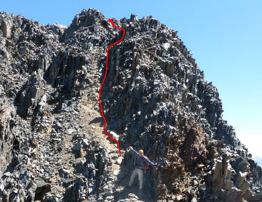 OK, so here’s our next mistake that you should avoid. We’d read about climbing up a gully to summit. The obvious gully in the middle is where we aimed (red line) and we took it all the way up. It was loose, steep and really ugly. Without Rick P. experimenting a route, I’d probably still be up there.