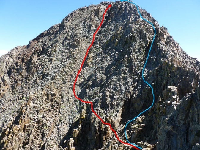 The right way is the blue line – I know it doesn’t look friendly at all, but it is actually great fun, solid with handholds everywhere as we learned on the way down.