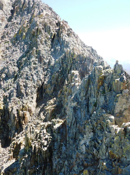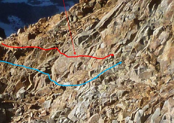 For those thinking of climbing this mountain – at this point from the upper saddle, there are a few ways to head up to the Southwest ridge of Wilson Peak. If you head straight off the saddle you quickly wind up on smooth, tilted rock with no hand-holds. Experienced climbers walk across it (red line), ignoring the consequences of a slip. I got part way across it and didn’t like it. We didn’t see then, but we did on the way back from today’s climb, that just 15’ below those slabs were good Class 3 moves with great hand-holds to accomplish the same thing (the blue line is approximate).