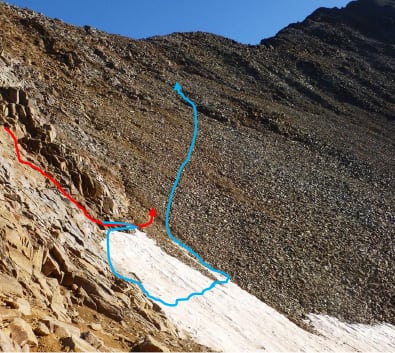 So what we did was to down-climb 100’ as described in some trip reports in an attempt to get just under those cliffs (red line). However, as you can see, there was still snow left right where we needed to go – and it was still frozen from the night temps. We had no spikes to help out.
