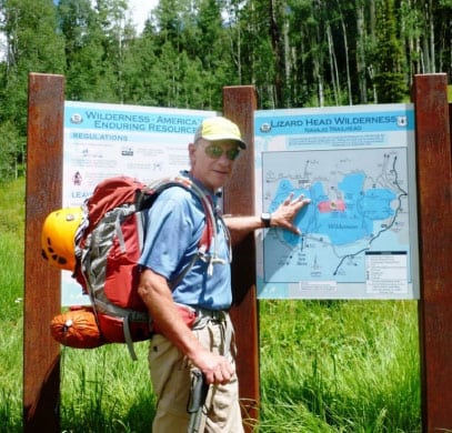 The Navajo Lake trailhead is reached by driving past Telluride on CO State Highway 145 over Lizard Head Pass. The Pass is named from the 13,119’ mountain called Lizard Head, a spectacular, dangerous and most difficult-to-climb feature that used to look more like a lizard head before a major rock slide years ago. It was used as a logo by the Rio Grande Southern Railroad.