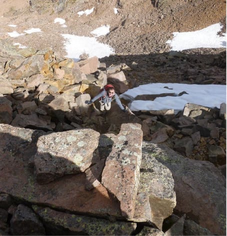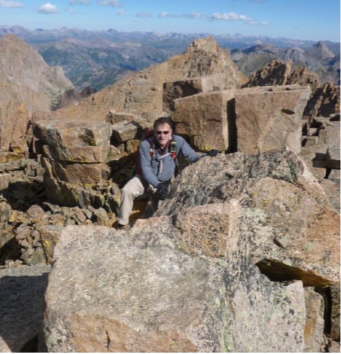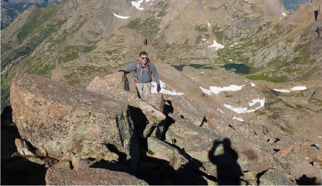 Brett Crandall here is making the Class 4 moves to the summit blocks of Sunlight Peak. Now that’s exposure!